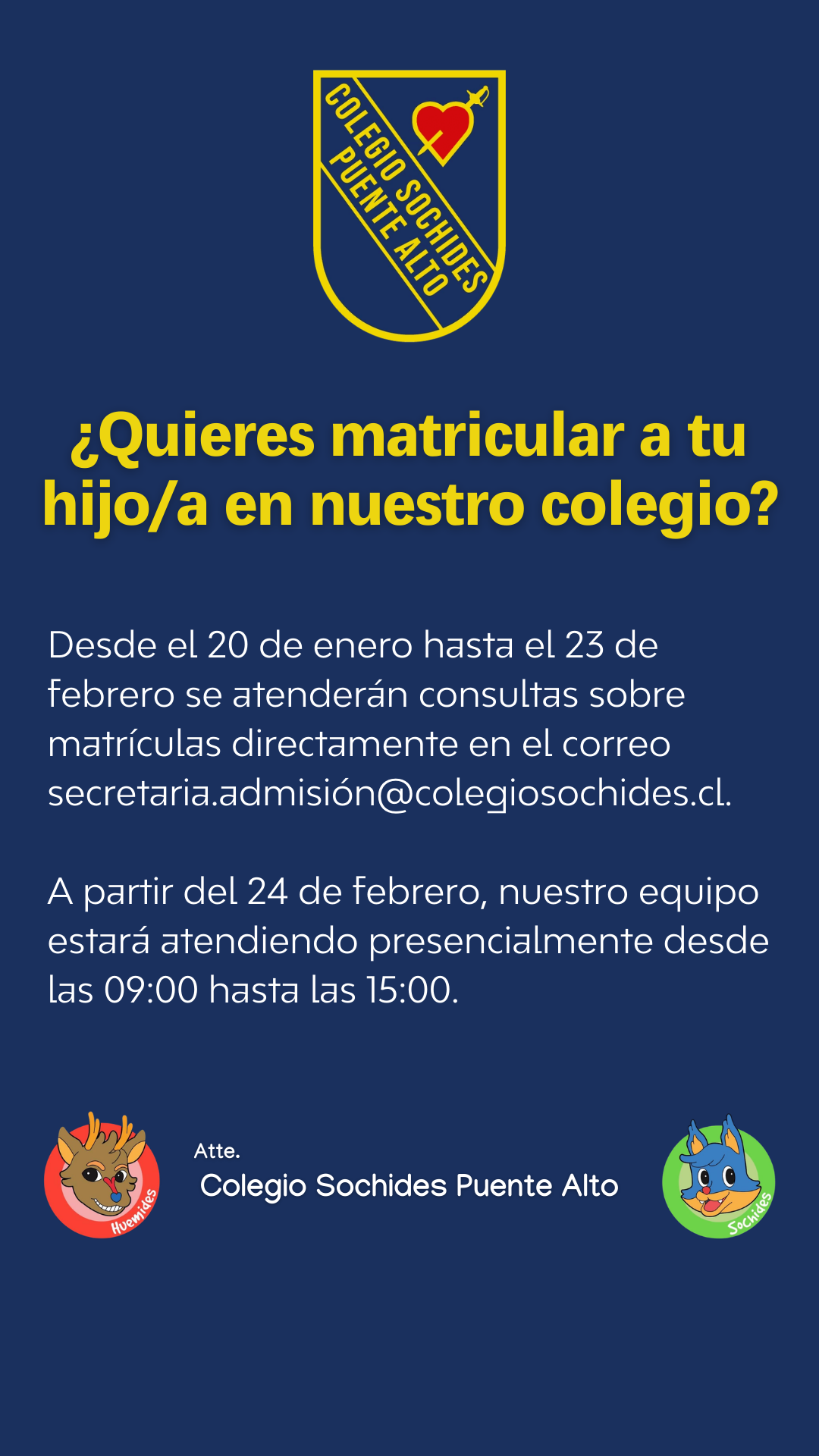 ¡MATRÍCULAS 2025 ABIERTAS! Acércate a nuestra secretaría o escríbenos al correo secretaria.admision@colegiosochides.cl