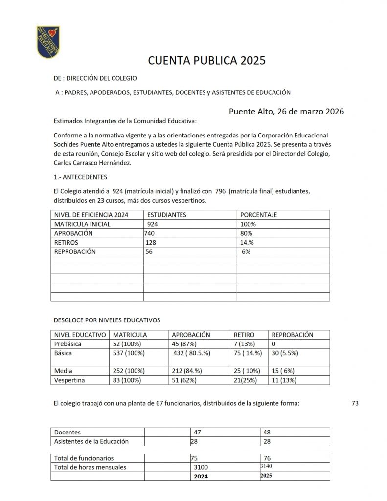 Conforme a la normativa vigente y a las orientaciones entregadas por la Corporación Educacional Sochides Puente Alto, compartimos a ustedes la siguiente Cuenta Pública 2025,